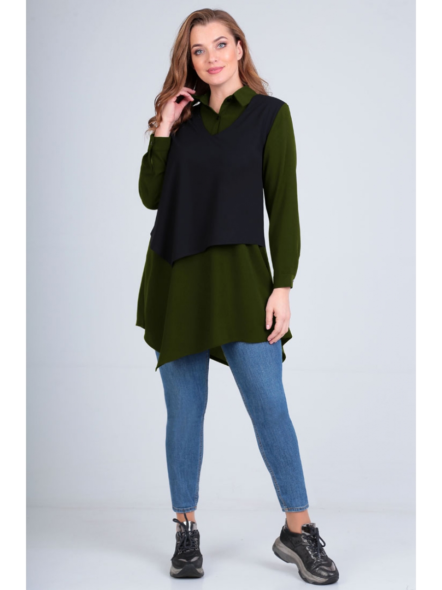 Модная блуза-туника, с имитацией жилетки из трикотажного полотна,что позволяет зрительно стройнить фигуру.Удлиненная, с ассиметричным низом в виде вытянутого угла на правую сторону. Подходит для женщин разных фигур.