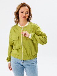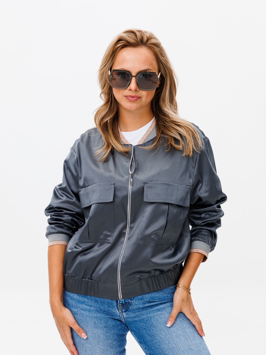 Бомбер прямого силуэта со слегка спущенным плечом из хлопковой ткани сатин, собран на резинку понизу. По переду настрочены карманы с встречной складкой и клапаном. Застежка на молнию по переду. Горловина обработана довязом. Рукав втачной одношовный собранный понизу на довяз.