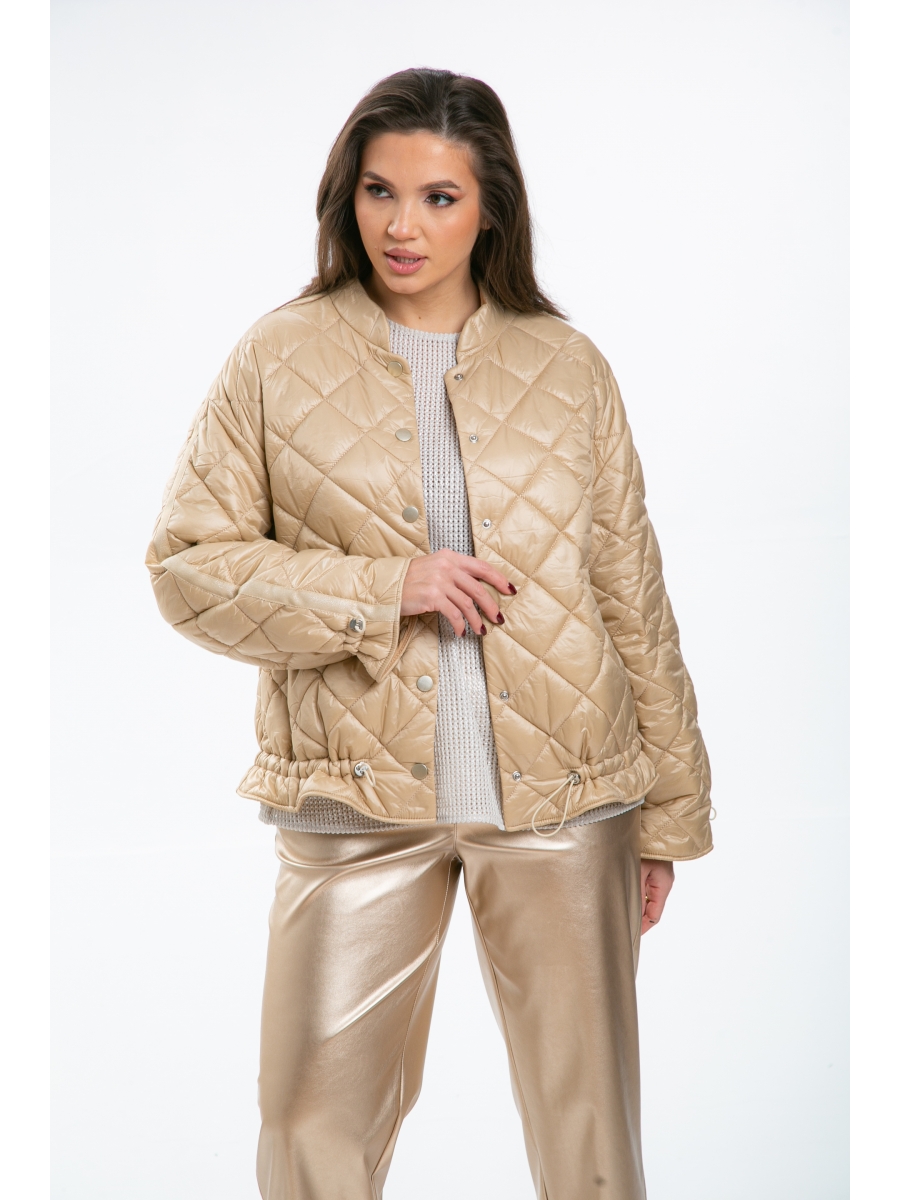 Силуэт прямой. Линия плеча спущена. Рукав прямой. Воротник стойка. По переду боковые рельефы, в рельефах карманы. По низу бомбера и по низу рукава кулиса, есть возможность регулировки изделия по обьему. Застежка центральная на кнопки. Спинка прямая со средним швом. По плечевому шву рукава и среднему шву спинки настрочена декоративная тесьма.