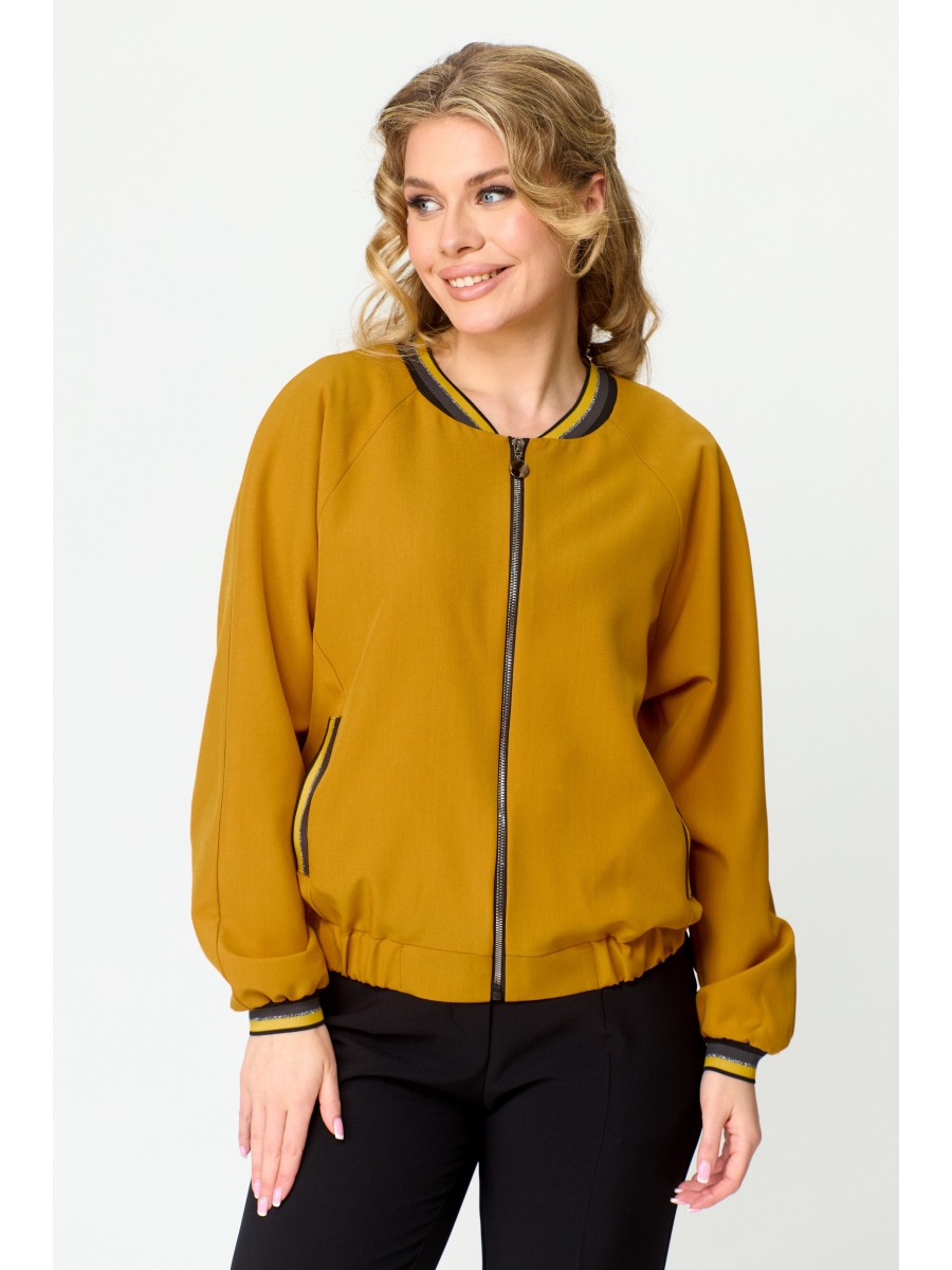 Свободный жакет-бомбер из костюмной ткани с декоративными манжетами по горловине, низу рукава. Застегивается на молнию. Рукав реглан. По переду карманы, расположенные в швах. По низу планка с эластичной тесьмой. Жакет на подкладке!
