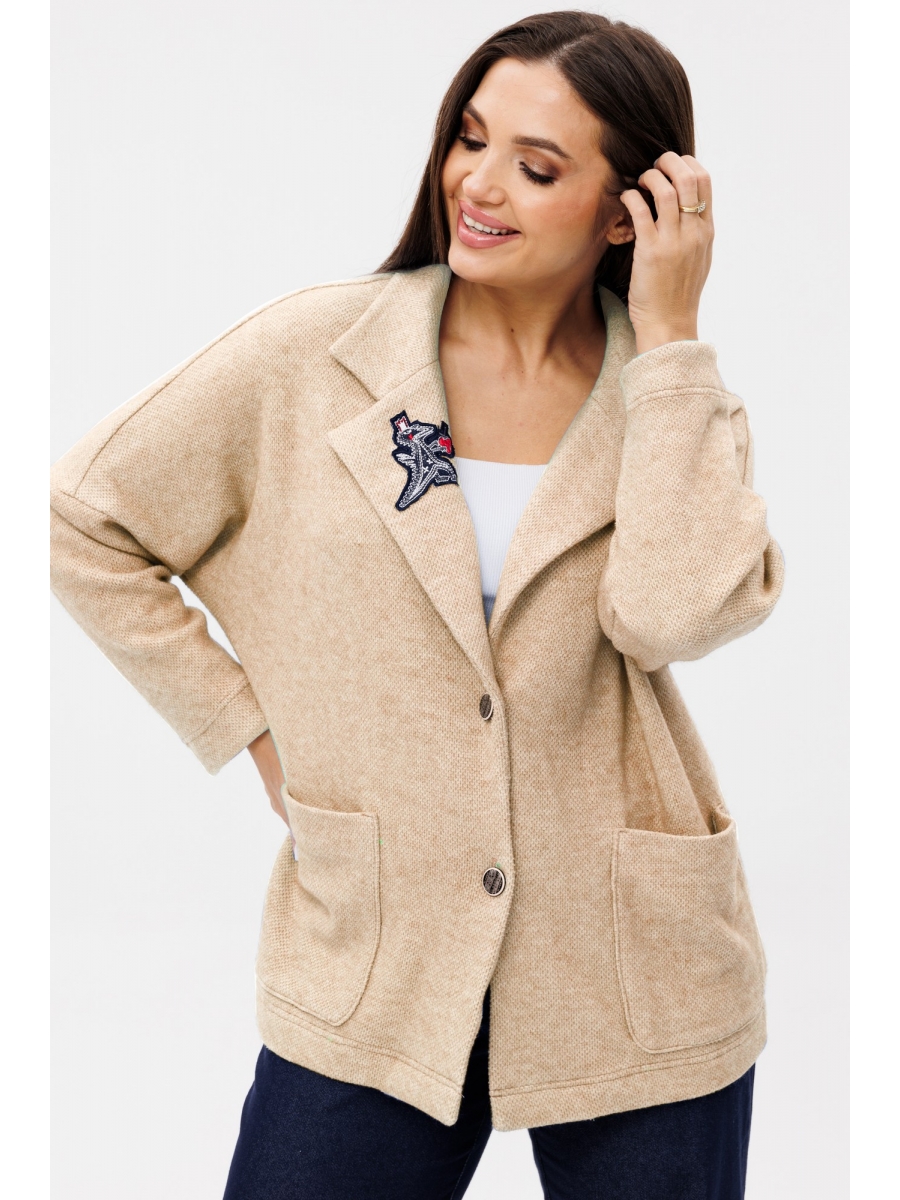 Воротник пиджачного типа. Перед с накладными карманамии декоративной нашивкой. Застежка центральная на петли и пуговицы. Спинка со средним швом. Рукав длинный одношовный втачной, линия плеча спущена.