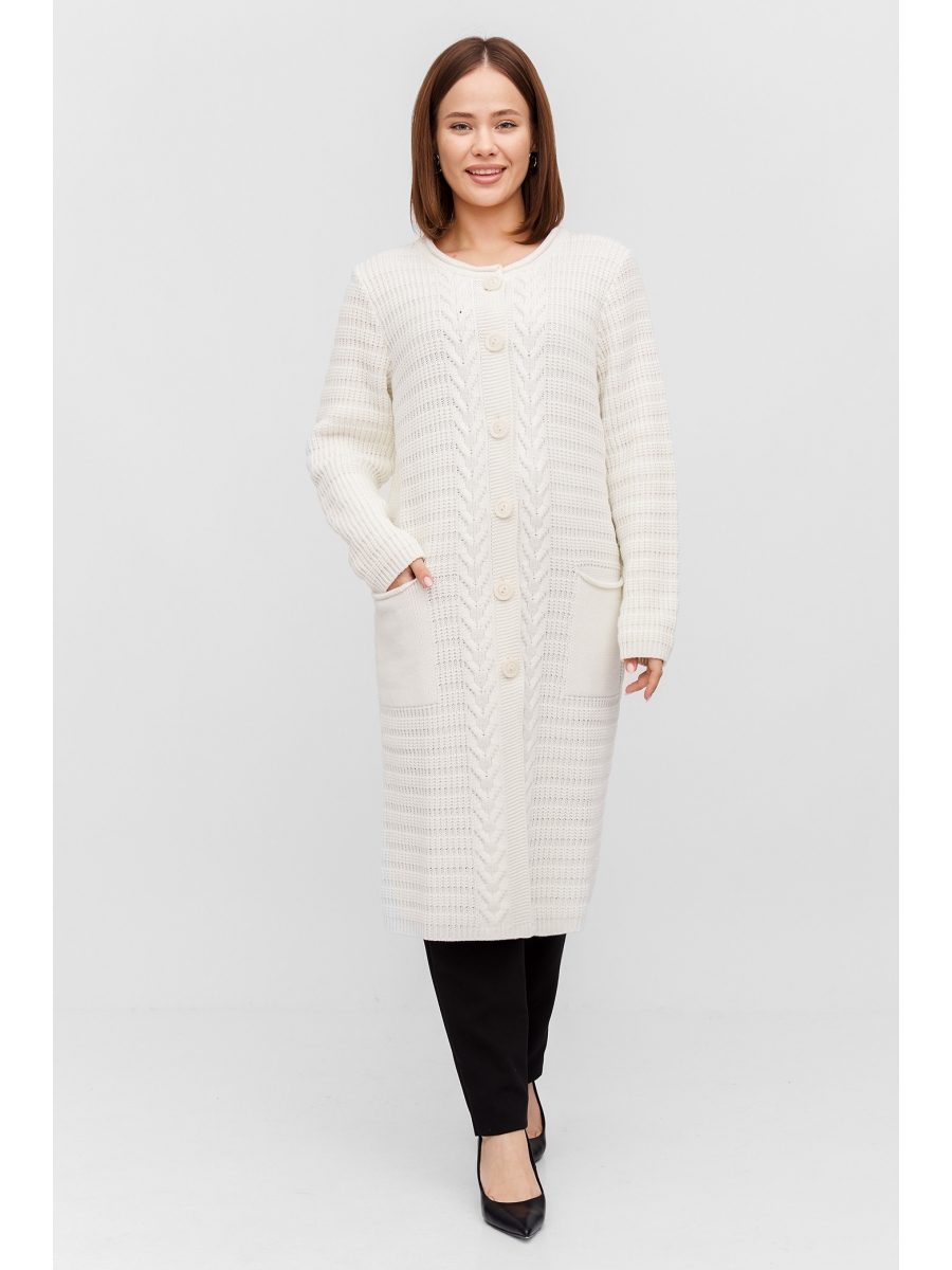 Стильный вязаный женский кардиган прямого силуэта на пуговицах с круглой горловиной. Рукав втачной полной длины. Накладные карманы. Оригинальный узор с ажуром и косами. Кардиган с добавлением шерсти согреет в прохладную погоду и придаст оригинальности любому повседневному образу.