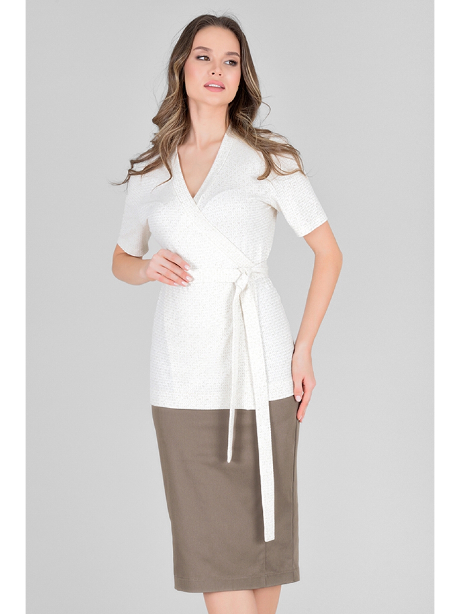 Кардиган из фактурного эластичного полотна. Полуприлегающий силуэт с запахом. Короткий втачной рукав. Вырез горловины оформлены бейкой из основной ткани, переходящий в пояс.
