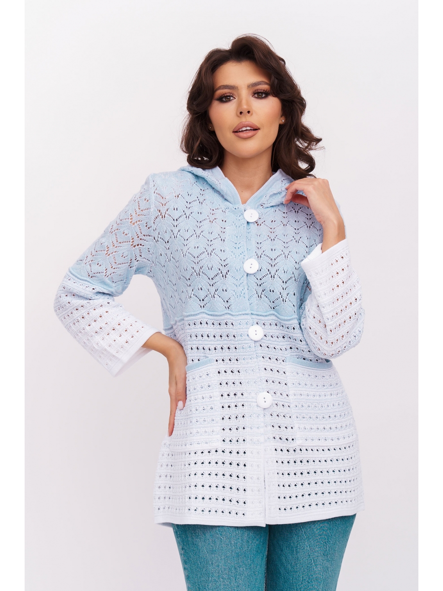 Ажурный удлиненный жакет полуприлегающего силуэта с капюшоном, застегивается на пуговицы. Рукава втачные длинной 7/8, немного расширены к низу. Два накладных кармана. Жакет выполнен ажурным переплетением с переходом цвета от светлого к темному.