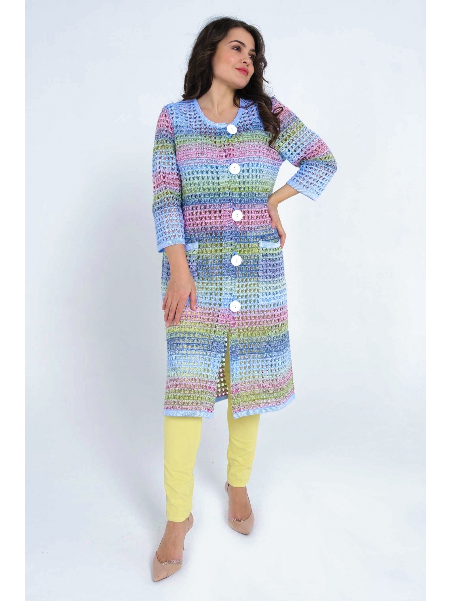 Свободный прямой силуэт и крупная сеточка придают кардигану оригинальную легкость. А цветовая гамма показывает в изделии романтический стиль. Представлена она светлыми, мягкими тонами и полутонами с нежными переходами от одного цвета в другой. Благодаря такому многоцветию палитра красок подобна радуге после дождя.