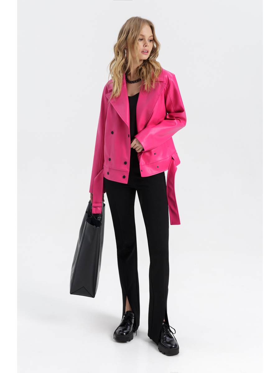 Оформить заказ →Куртка свободного покроя из искусственной кожи. Детали: прямой силуэт, спущенная линия плеча, смещенные рельефы с нагрудными вытачками и функциональными карманами, кокетки переда и спинки, длинные рукава, смещенная застежка на кнопки