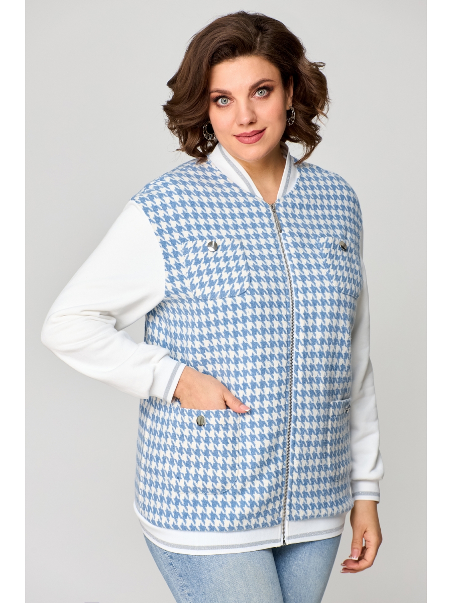 Бомбер женский прямого силуэта, с эластичным поясом по низу, со спущенной линией плеча. Застежка на молнию. Горловина круглая с эластичным воротником в виде стойки. Спереди два накладных кармана в верхней и нижней части. Рукава длинные, втачные из отделочной трикотажной ткани, по низу эластичные манжеты. Без подкладки.