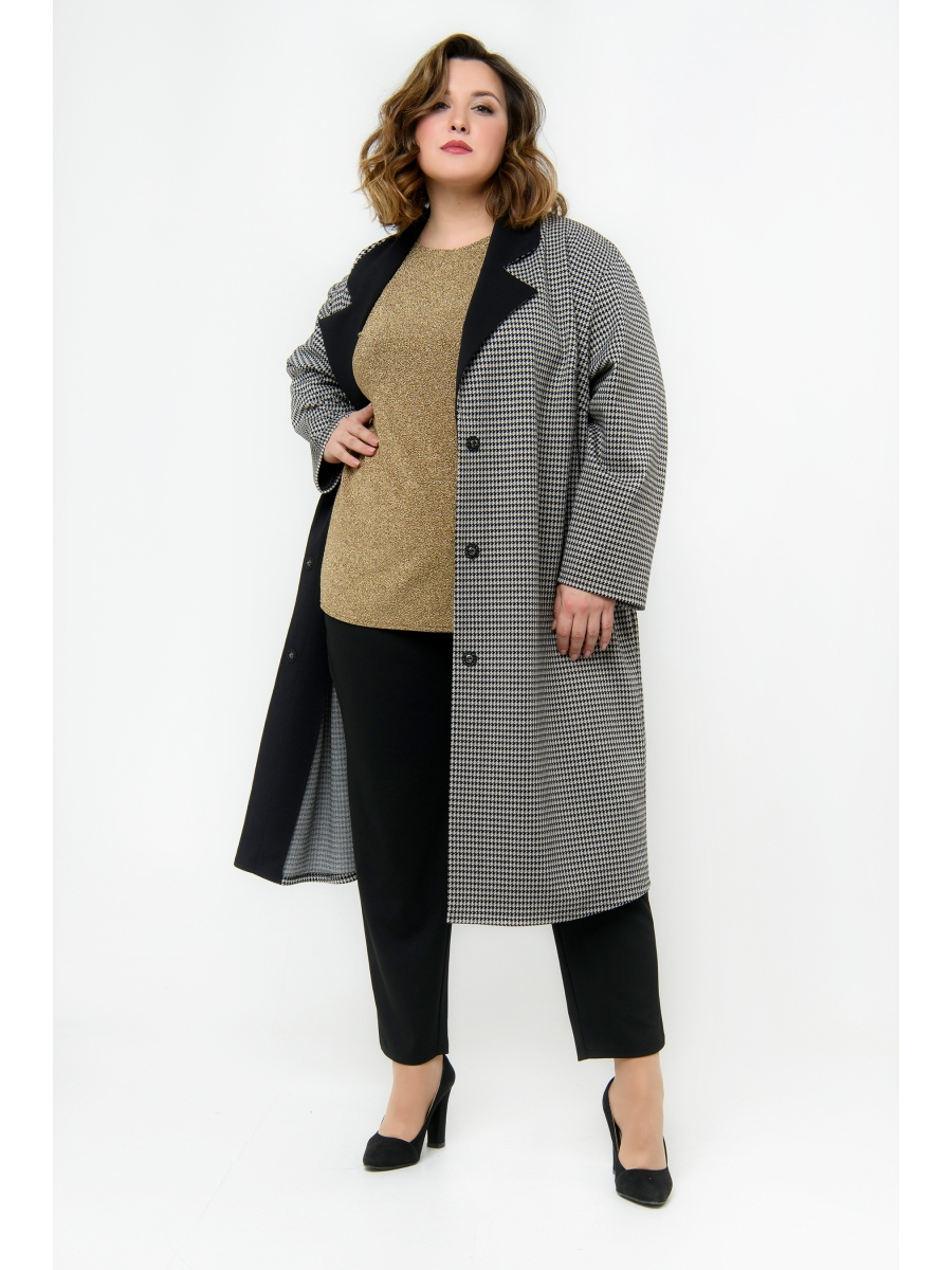Кардиган - "летнее" пальто "оверсайз", выполнен из трикотажного джерси. Ткань содержит вискозу и небольшой процент эластана. Модель свободная, прямого силуэта, с карманами в боковых швах, застегивается на 3 пришивные кнопки. Лацканы и воротник из ткани-компаньона черного цвета. Рукав длинный.
