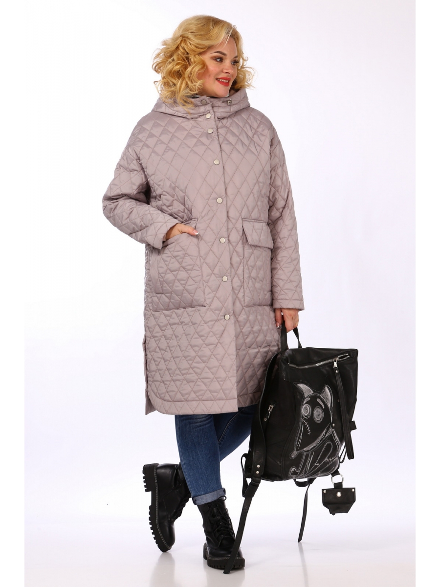 Пальто женское демисезонное прямого силуэта изготовлено из курточной стеганой ткани на синтепоне (наполнитель плотностью 150 г/м2). Перед с накладными двойными карманами. Горловина оформлена капюшоном с кулисой, в которой втянут шнур с фиксаторами. Застежка на кнопки. Рукав спущенный. Низ изделия фигурный с разрезами, застегивающимися на кнопки. Изделие на подкладке. Сезон — морозная осень, температурный режим до -5С.
