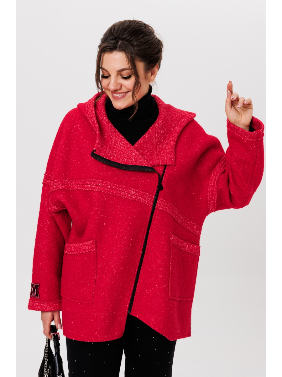 Женское полупальто для повседневной носки выполнено из шерстяной пальтовой ткани без подкладки. Полупальто длиной до бедер свободного кроя с капюшоном. Плечо спущенное, рукав длинный втачной, один рукав украшен нашивкой. Перед изделия с асимметричной косой застежкой на разъемную тесьму-молнию. Спинка прямая цельная. Полупальто украшено рельефными швами срезами наружу. По переду накладные карманы. Низ изделия разноуровневый с необработанным краем. Полупальто смело сочетается с любым низом (юбка, брюки, джинсы) и обувью.