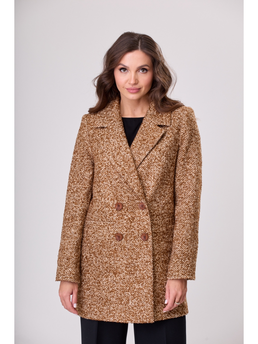 Полупальто двубортное, прямого силуэта, выполнено из пальтовой ткани. Воротник пиджачного типа, застежка двубортная на петли и пуговицы. На переде прорезные карманы с втачной листочкой, нагрудная вытачка. Рукав втачной, двухшовный. Спинка со средним швом. Пальто на подкладке.