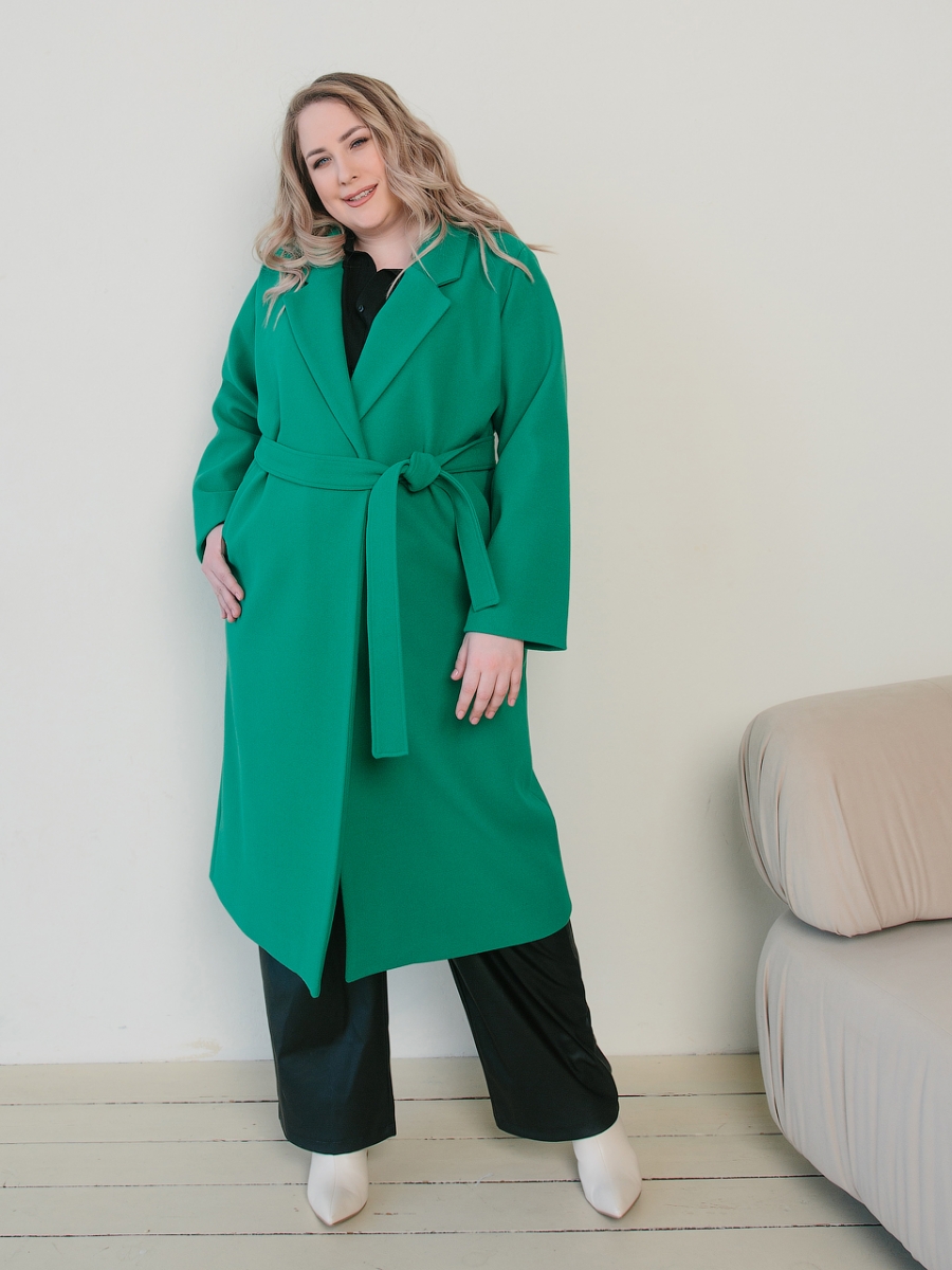 Оформить заказ →Пальто без застежки.Пояс в комплекте. Карманы прорезные по линии талии, с листочкой. Изделие на полном подкладе.