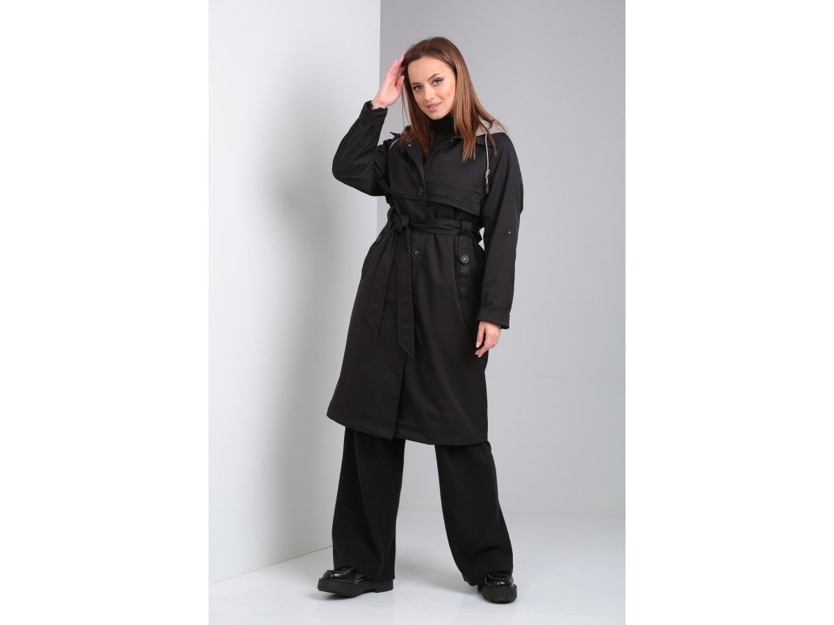 Модный, стильный плащ прямого силуэта, выполнен из качественной плащевой ткани, на подкладке. Рукав длинный, реглан с патой на кнопку. Воротник отложной со стойкой и капюшоном. Изделие с центральной застёжкой на кнопки с имитацией пуговиц . По переду и спинке плаща - отлетная кокетка. В передней части обработаны прорезные карманы с листочками. Капюшон контрастного цвета, съемный, регулируется декоративным шнуром. Талия акцентируется съемным поясом из основной ткани. Низ изделия на регулируемой кулисе.