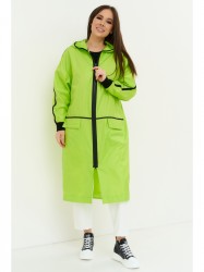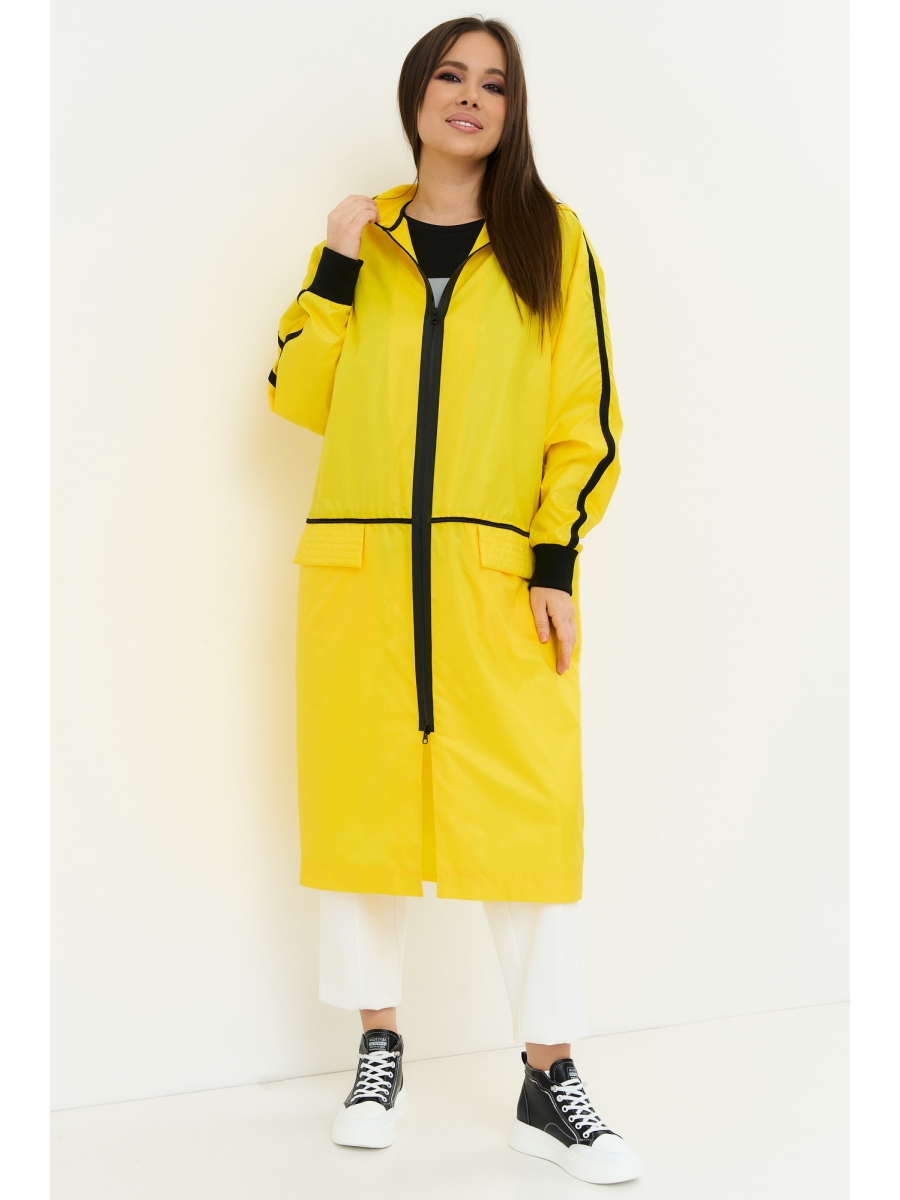 Стильный яркий плащ прямого кроя, без подкладки, с центральной застежкой на молнию. Рукав спущен, дополнен притачной трикотажной манжетой. Плащ дополнен капюшоном и боковыми карманами.