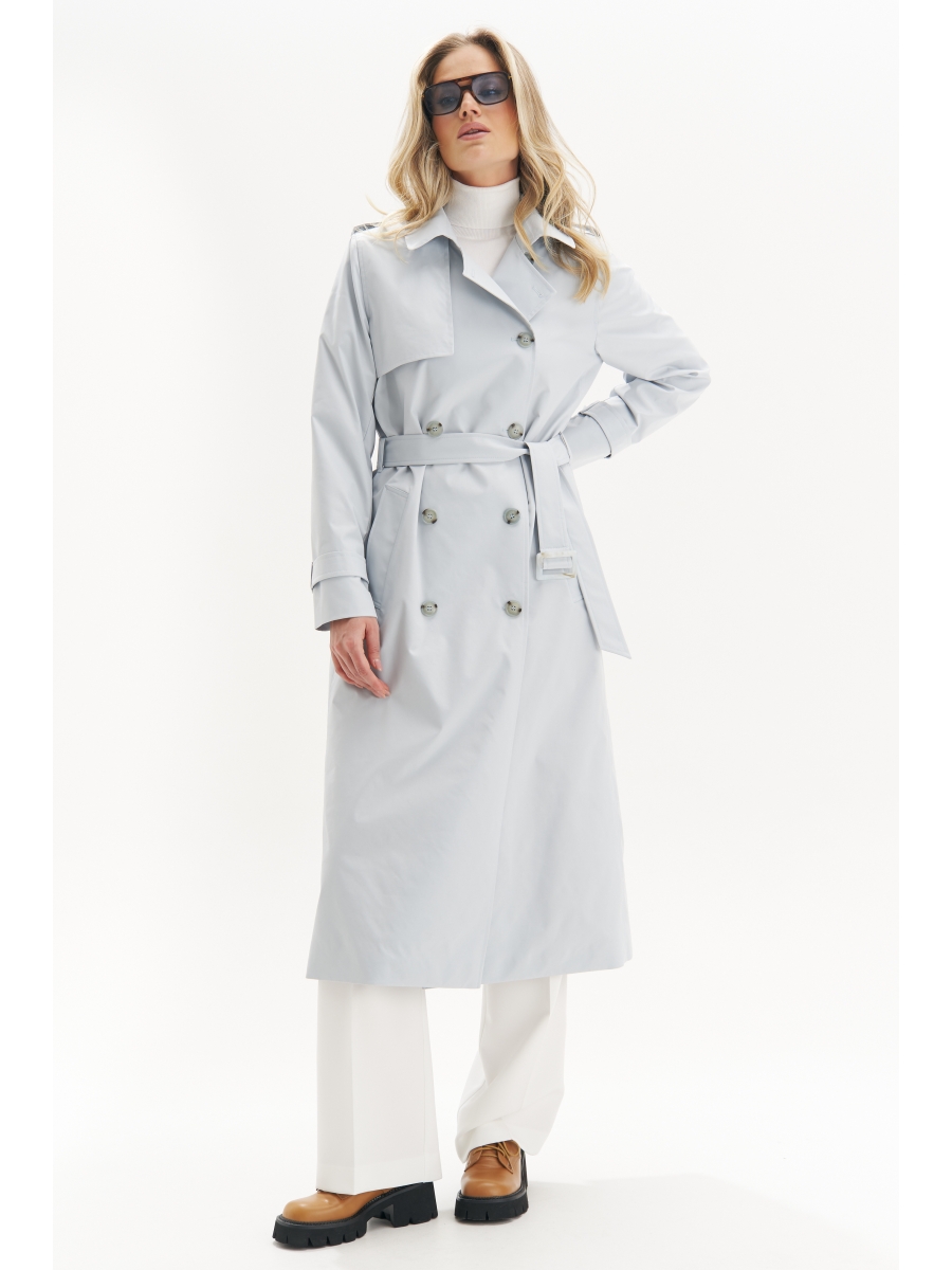 Плащ женский, прямого силуэта, выполнен из плащевой ткани, на подкладке, с двубортной застежкой на 7 петель и 10 декоративных пуговиц до верха (размер и цвет фурнитуры может незначительно отличаться от фото), для повседневной носки. Борта могут быть застегнуты до верха, или расстегнуты с разложенными в разные стороны лацканами. Плащ со съемным поясом и декоративной пластиковой пряжкой, с настрочными шлевками по линии талии. Перед и спинка с отрезным бочком. Перед с прорезными карманами с листочками. Правая часть переда с отлетной кокеткой. Спинка с отлетной кокеткой, со средним швом в нижней части которого обработана шлица. Горловина оформлена стояче-отложным воротником со стойкой. Рукава втачные, двухшовные, по низу с настрочными шлевками, с патами с декоративными пластиковыми пряжками. Плечевые швы с погонами, застегивающимися на 1 петлю и 1 пуговицу.