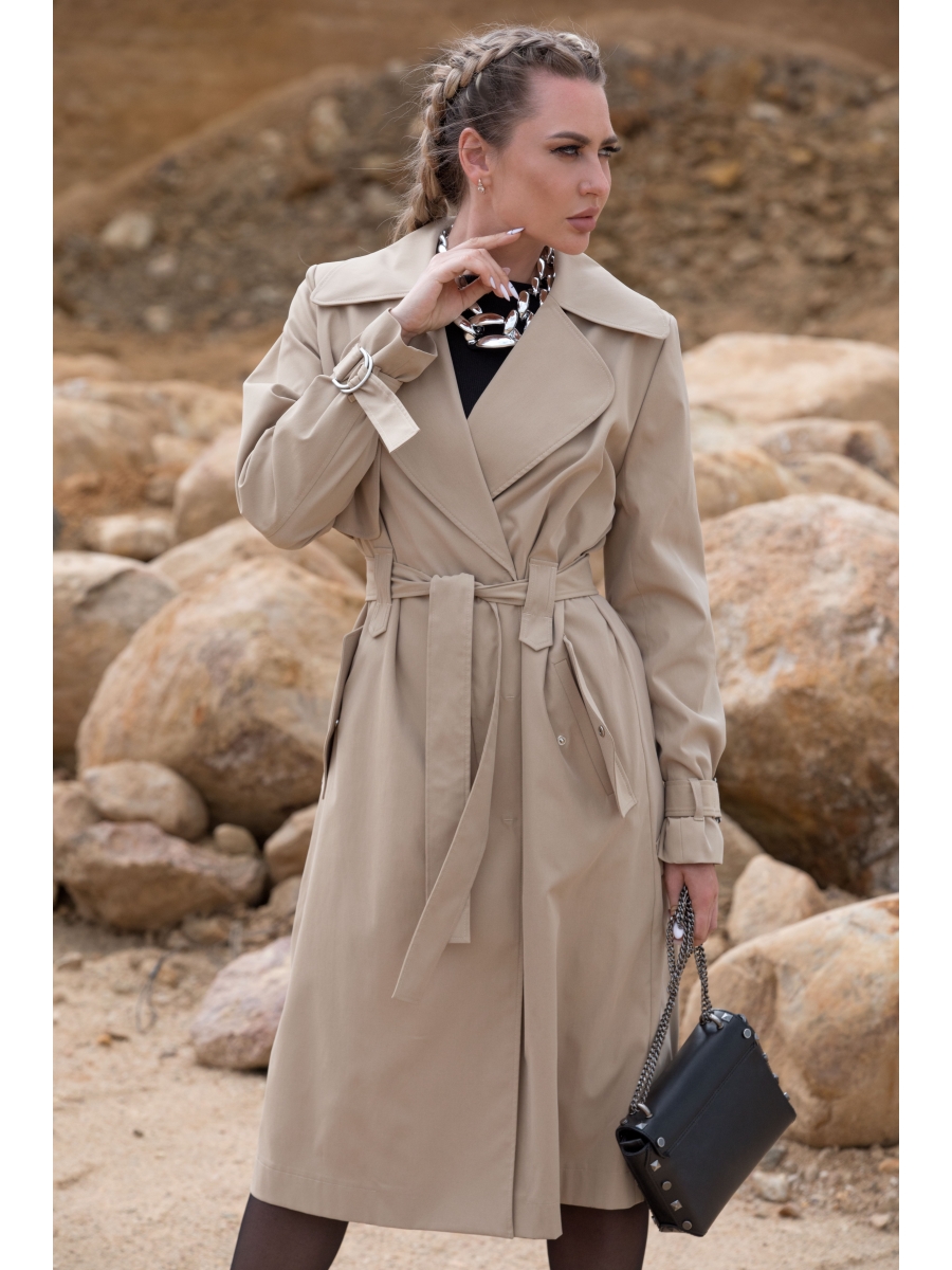 Плащ с центральной двубортной застежкой на пришивные кнопки, втачным воротником , отложными лацканами. По переду с отлетной кокеткой, прорезными карманами с листочками и клапанами, застегивающимся на кнопки. На переде- паты для пояса. Спинка цельная с патами для пояса. На по низу рукавов- паты, зафиксированные шлевками и петлями с пуговицами. Плащ со съемным поясом.