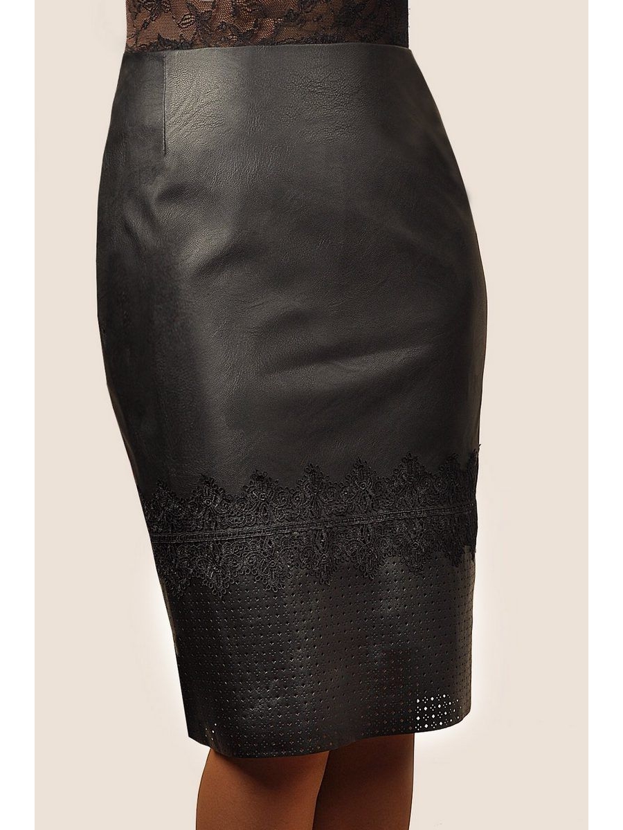 Юбка из эко-кожи, на подкладке, по спинке потайная молния и шлица. Перед юбки состоит из двух частей, нижняя часть из перфорированной кожи 20см,верхняя часть из гладкой кожи, сзади юбка вся из гладкой кожи. Отделка- кружево. Ширина кружева 11см.