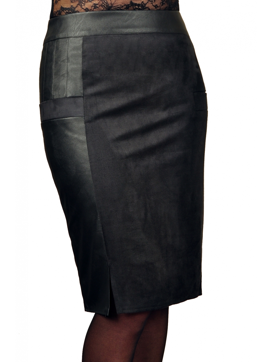 "Юбка-карандаш из комбинации двух тканей: экокожи и замши спереди и полностью кожаной сзади.По спинке центральный шов,застежка потайная молния, шлица. Юбка на подкладке.