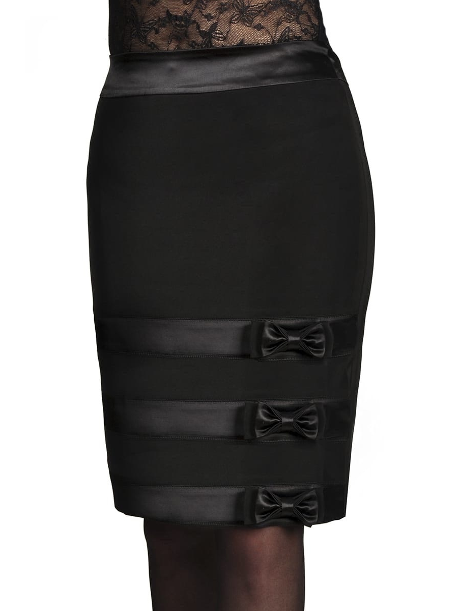 Юбка классический карандаш. На подкладке. Пояс сшит из атласной ткани. По передней части нижний край юбки прошит тремя лентами из атласной ткани. На лентах декоративные банты ручной работы. По спинке центральный шов и шлица, застежка потайная молния