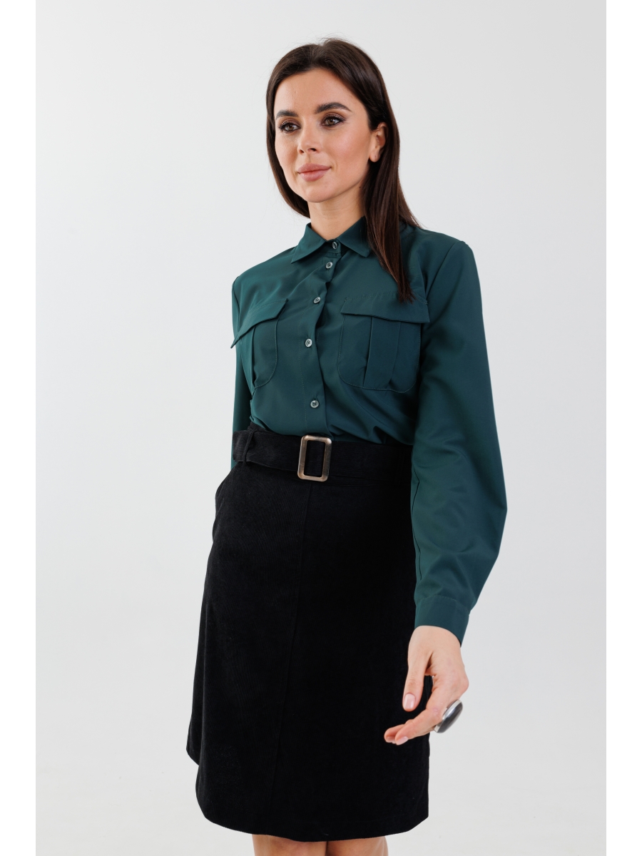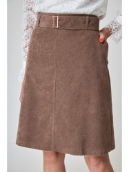 Юбка женская, силуэт трапеция, длина до колена. Высокая посадка, подчеркивающая вашу талию и визуально удлиняющая ноги. Дополнительно можно подчеркнуть талию при помощи съемного пояса. По спинке декоративные клапаны на бедрах, в среднем шве потайная застежка-молния. Функциональные карманы в боковых швах. Есть подкладка из полиэстера.