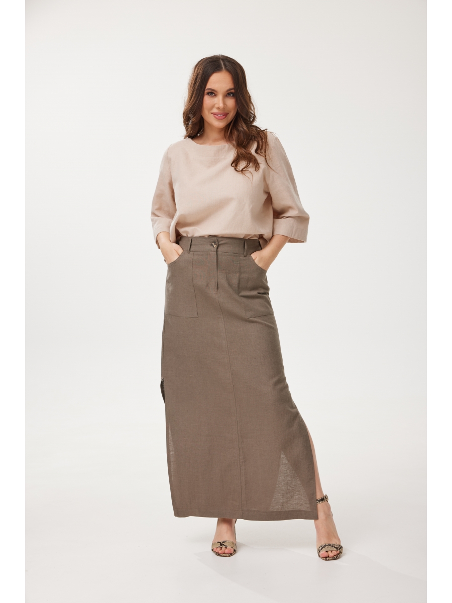 Стильная юбка макси из качественного мягкого льна с эффектом мятости с накладными карманами, с разрезом по бокам украсит разные типы фигуры. Юбка подходит как на работу, так и для прогулок и отдыха. Модель с притачным поясом, в задней части пояса вставлена резинка с застёжкой на тесьму-молнию и пуговицу на поясе. На задней половинке расположены притачные кокетки с клапанами.
