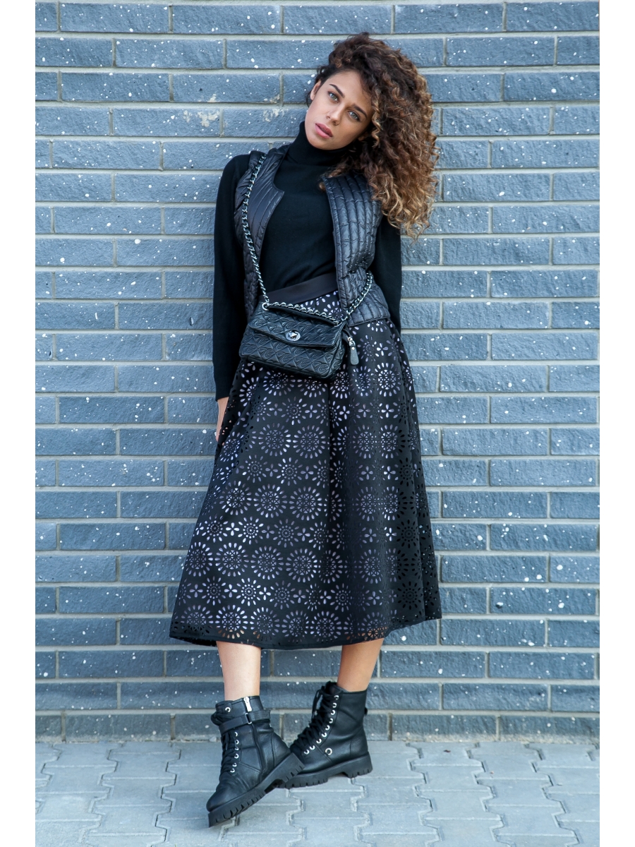 Оформить заказ →Роскошная двухслойная юбка “миди” на поясе со складками. Застежка молния в боковом шве. Верхний слой перфорированный трикотаж. Нижний слой из легкой плательной ткани.