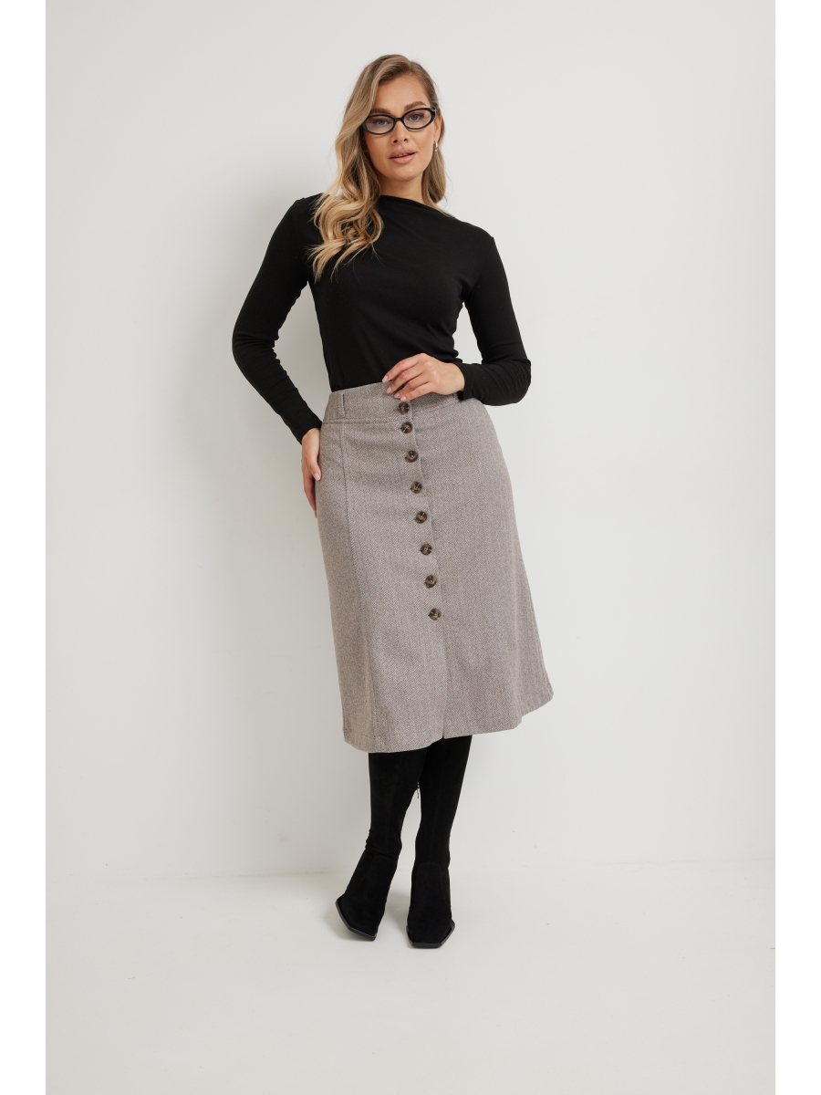 Стильная юбка-трапеция длиной миди из мягкой приятной ткани "ёлочка". Юбку можно носить в демисезон: весна, зима и осень, подходит как на работу, так и для прогулок и отдыха. Модель с широким притачным поясом застёгивается на декоративные пуговицы, что придаёт особый шарм. Передние и задние половинки с рельефами.