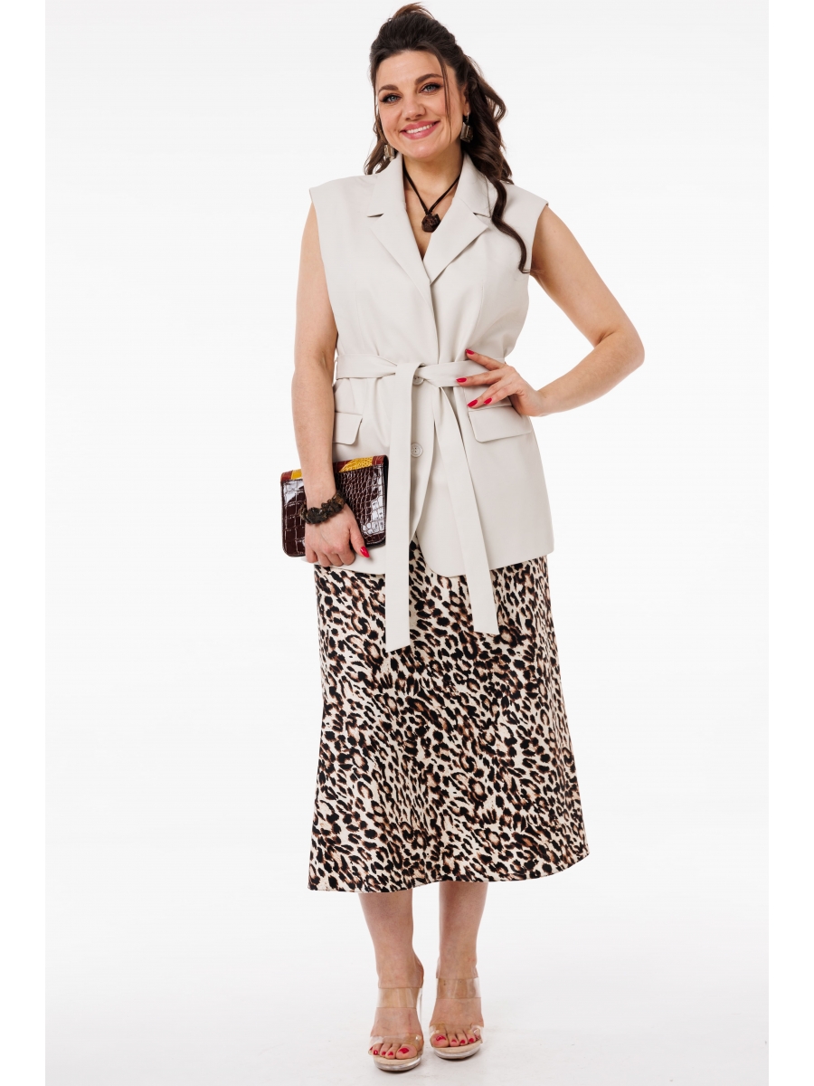 На модели в юбке цвета «светлый лео» жилет из эко кожи 1502.1, рубашка из атласа 1503, топ 1440 и черная рубашка 1203.