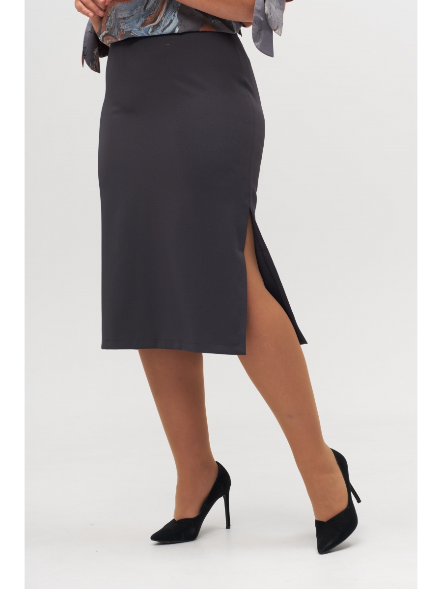 Юбка женская, силуэт карандаш, длина миди. По спинке талиевые вытачки и потайная молния в среднем шве, пояс - на петлю пуговицу. В левом боковом шве игривый разрез.