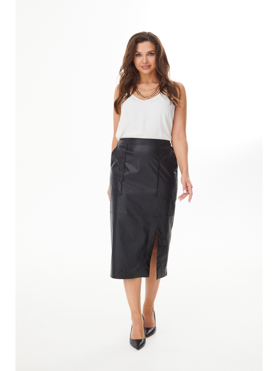 Юбка прямого силуэта из экокожи на подкладке. Спереди - горизонтальный рельеф, из рельефа по переду слева разрез. Накладные карманы с косым входом. Пояс прямой сзади на резинке. Сзади застежка - молния.