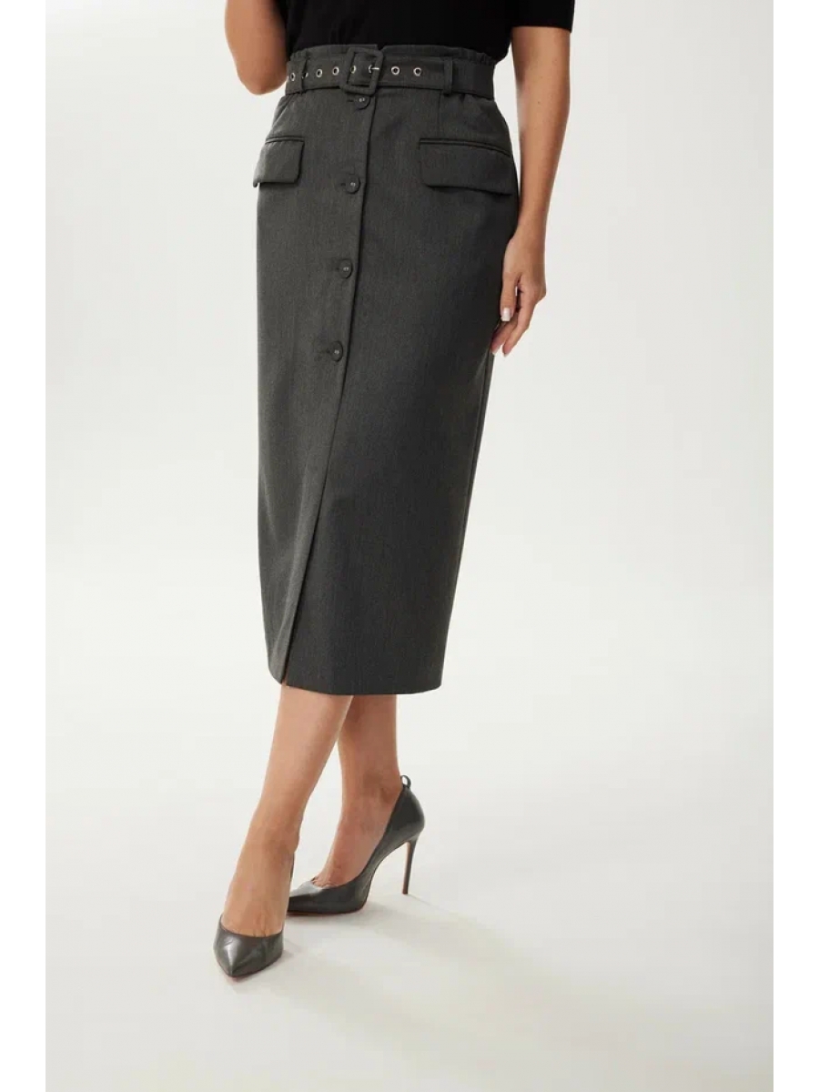 Юбка миди прямого силуэта слегка зауженная книзу. По переду прорезные карманы с клапаном и двумя обтачками. Спереди - застежка на пуговицы. Пояс прямой, сзади резинка. В комплекте ремень из основной ткани с блочками и пряжкой, обтянутой основной тканью"