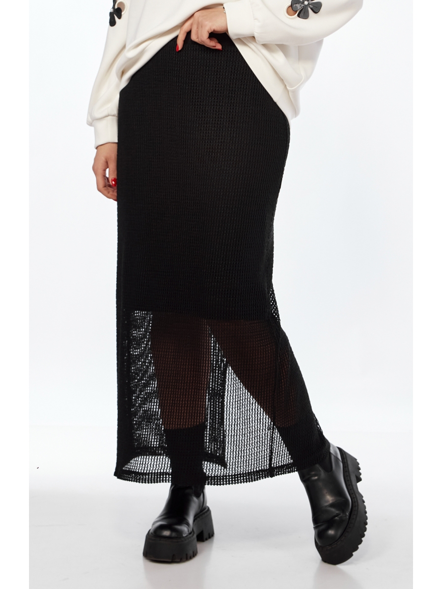 Юбка зауженная к низу из ажурного трикотажного полотна на подкладке. Сзади-разрез. Юбка с поясом на резинке.