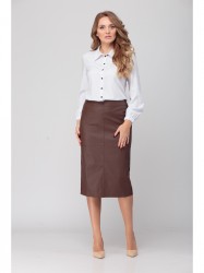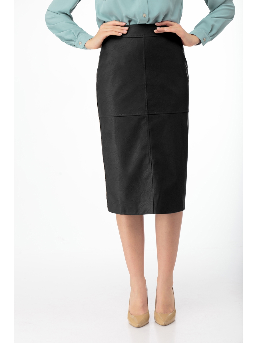 Элегантная юбка-карандаш из эко-кожи. Перед со средним швом и поперечным. Спинка с застежкой на молнию в среднем шве и разрезом. В боковые швы вставлен кант. Юбка выполнена на подкладке.