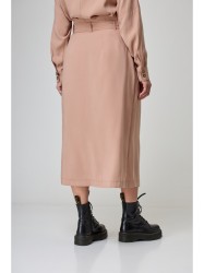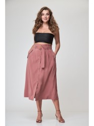Юбка А-образного силуэта, длины миди, на широком притачном поясе, со шлевками. По переду выполнены боковые карманы с клапанами и функциональная планка на петли и пуговицы. Пояс из основной ткани, с пряжкой.