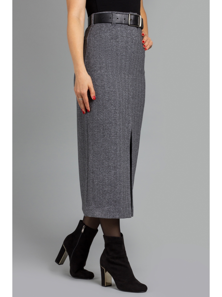 Тёплая юбка полуприлегающего силуэта длиной миди с притачным поясом, с застёжкой на тесьму-молнию и пуговицу на поясе. На передней половинке внутренние карманы. На задней половинке расположены притачные кокетки с клапанами.