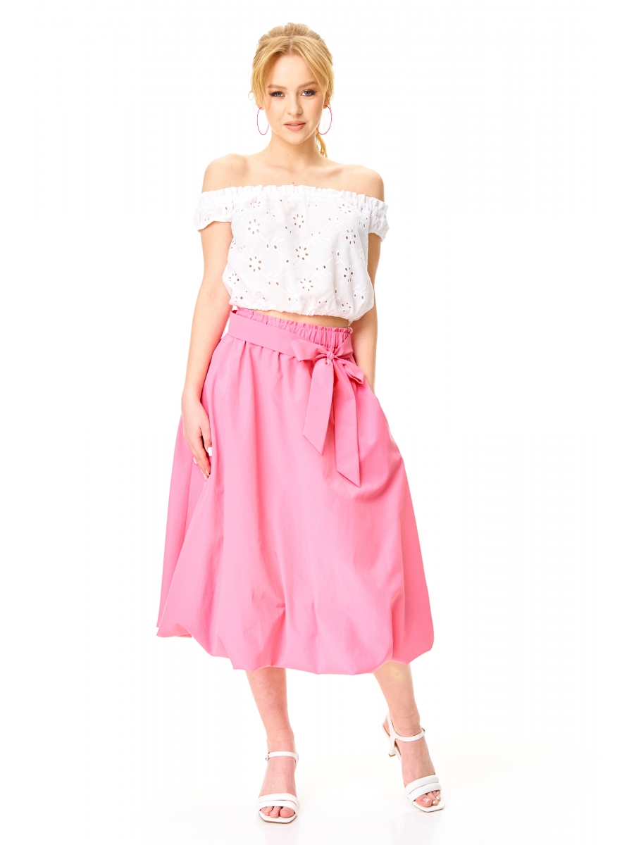 Воздушная юбка-баллон с глубокими карманами. Пояс широкий, собран на эластичную тесьму «резинка». Юбка на подкладке. Съемный пояс-бант.