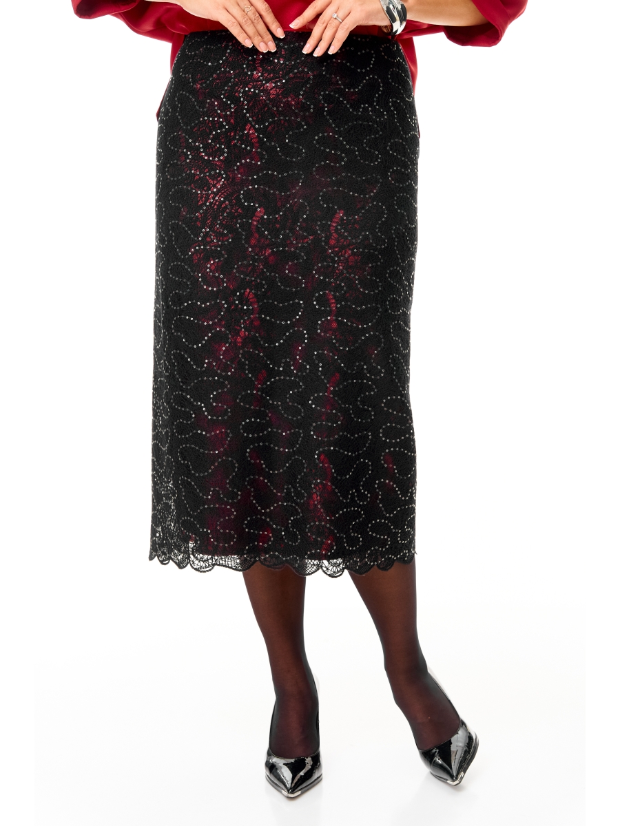 Юбка из плотного черного кружева на красной саржевой подкладке зауженная к низу с разрезом по спинке. Застежка «потайная молния» по среднему шву спинки. Верх на обтачке.