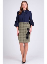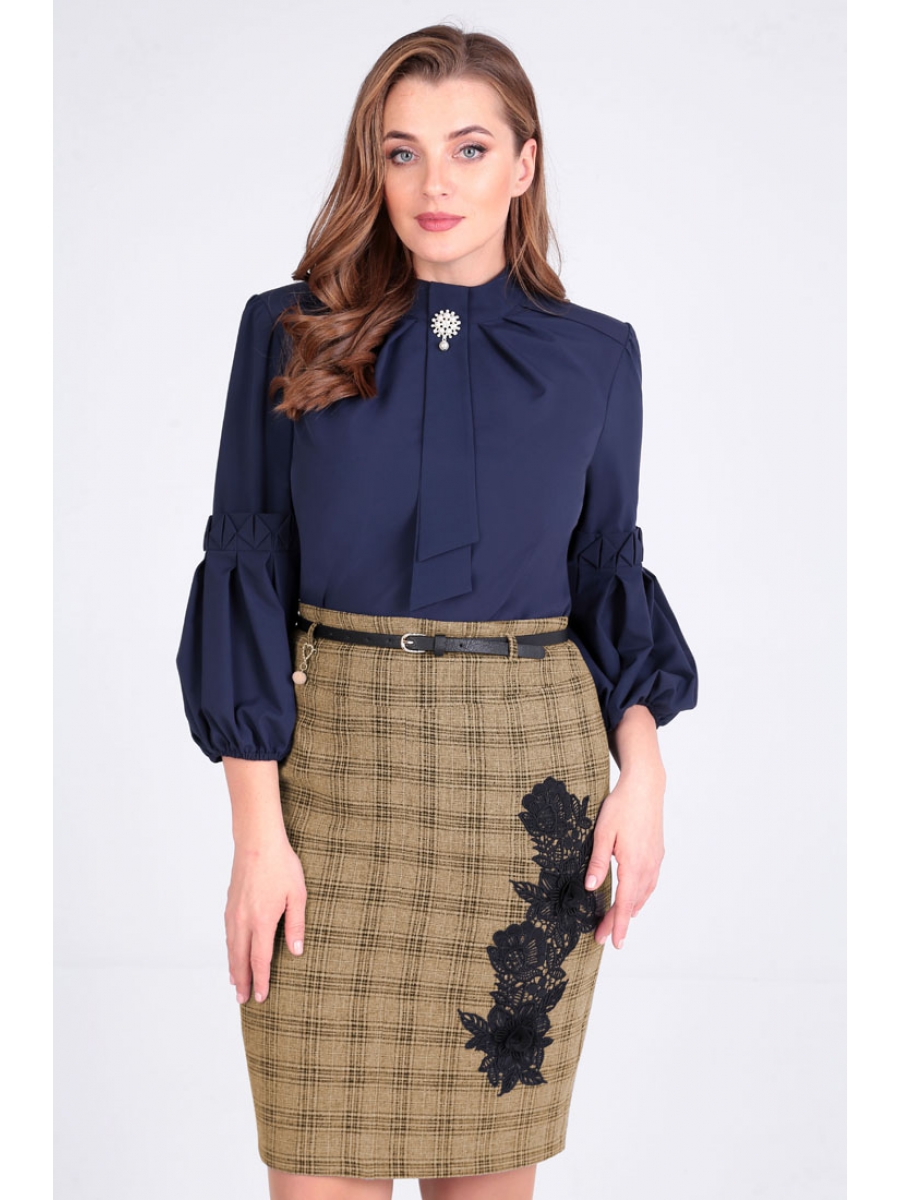 – Женская, стильная юбка в клетку, прямая, зауженная к низу,украшена настроченной кружевной аппликацией. Пояс обработан обтачкой. Для комфортного одевания юбки предусмотрена застежка в виде потайной молнии сверху, по центру спинки. Юбка на подкладке. Дополнительную свободу движений обеспечит шлицасзади. Спереди модель украшена кокеткой закругленной формы, а по спинке кокетка прямая, на которой настрочены шлевки под узкий ремешок. Также юбка украшена украшением-брошь. По центру переда на юбке обработаншов.