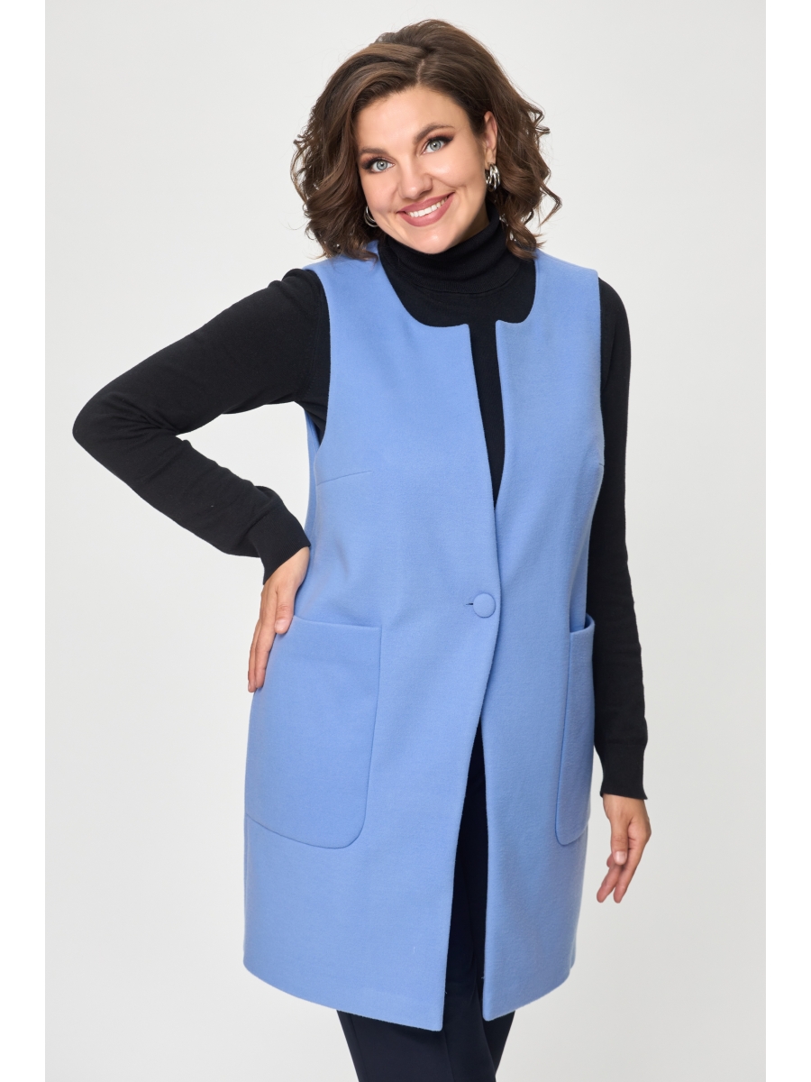 Жилет прямого силуэта с нагрудными вытачками. Мягкий кашемир в нежном голубом цвете и идеальный конструкторский замысел позволили идеально подчеркнуть фигуру в любом размере.