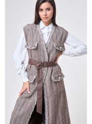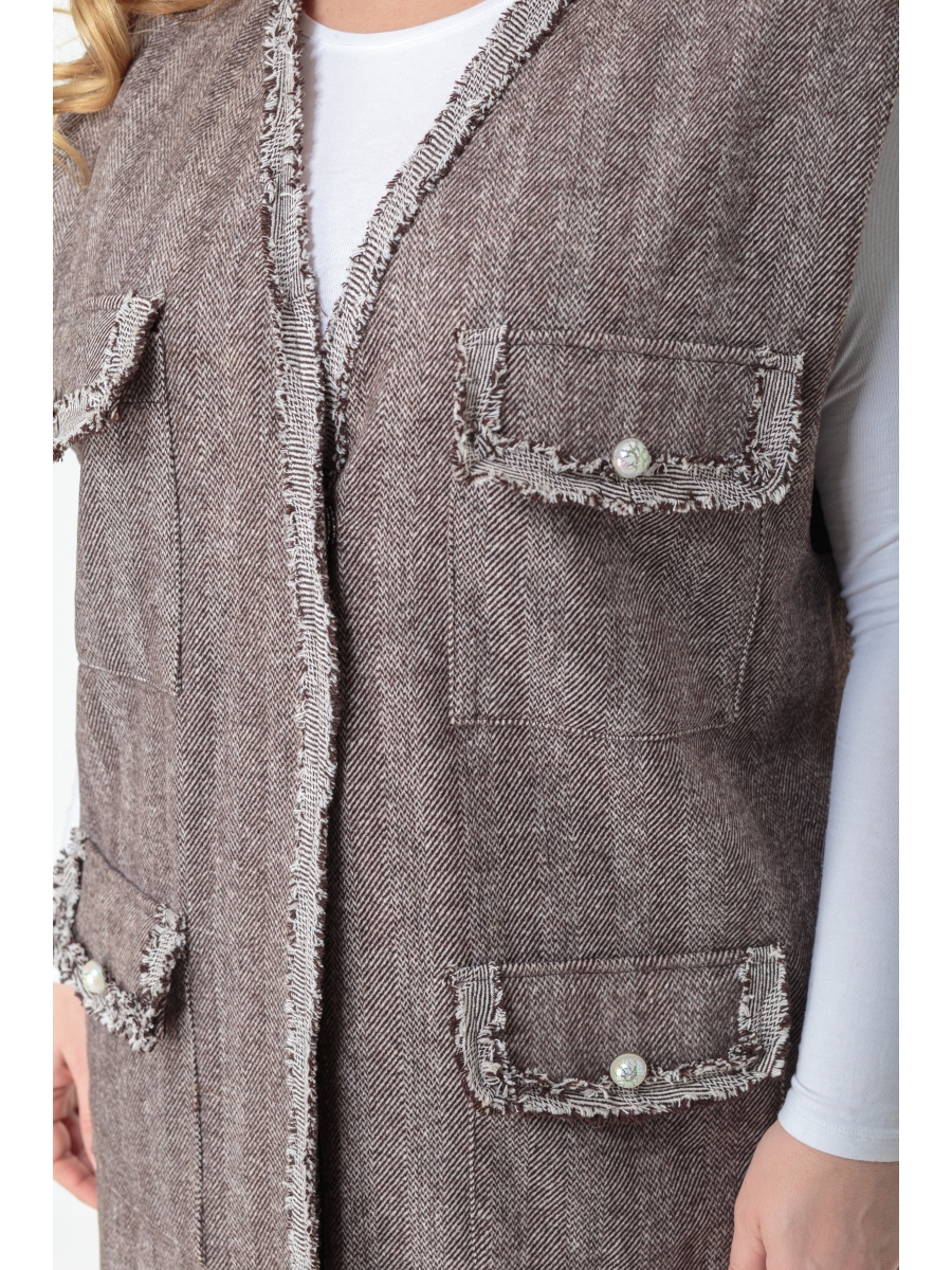 Жилет с отделкой тесьмой ручной работы. Стилизованные накладные карманы с клапанами. Спинка со средним швом и шлицей.