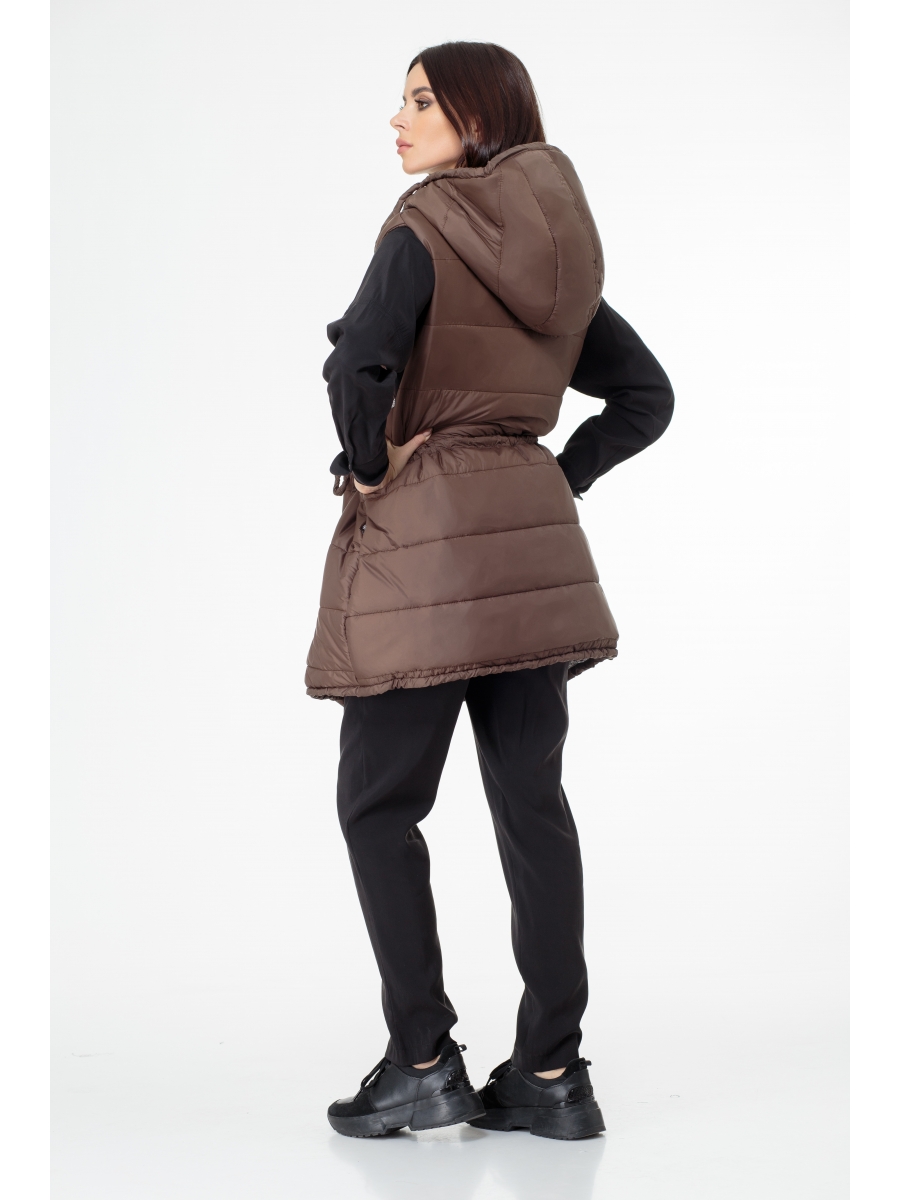 Удлинённый жилет из невесомой стеганой болоньи с наполнителем- тренд сезона! Прямой силуэт с завышенными прибавками по обхватам для удобной носки и комбинирования жилета с верхней одеждой. Объёмный капюшон, застёжка на разъемную молнию по всей длине. В области талии, по низу и в капюшоне шнурки, обтянутые тканью верха для фиксирования обхватов по вашему желанию.