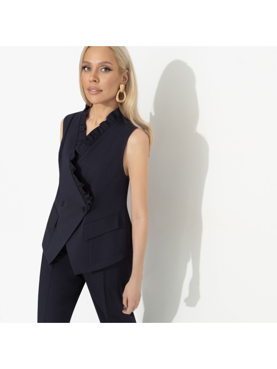 Псс! Вы слышали большой модный секрет? Рассказываем: жилет с рюшами будет хитом нескольких следующих сезонов. Нам передали это сверху. Только больше никому. Жилет приталенного кроя. Застегивается на пуговицы. Пуговицы в тон изделия. Имитация карманов на передней части изделия. Рюши вшиты.