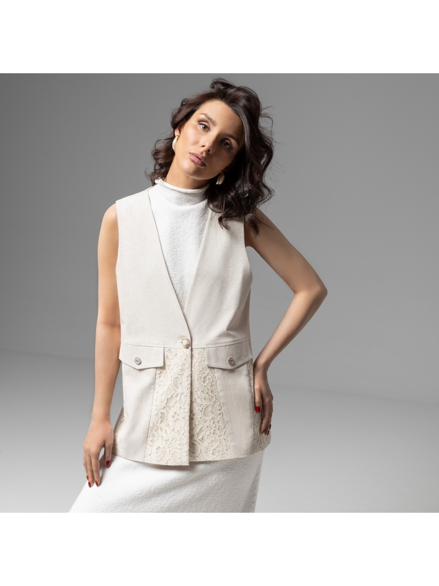 Оформить заказ →Истинное воплощение стиля old money. Оттенок, посадка и силуэт жилета премиальной коллекции CHARUTTI говорят о роскошном вкусе его обладательницы. Жилет прямого кроя. Дополнен кружевом. Эксклюзивная фурнитура. Имитация карманов. Есть подклад из шелковистого материала.