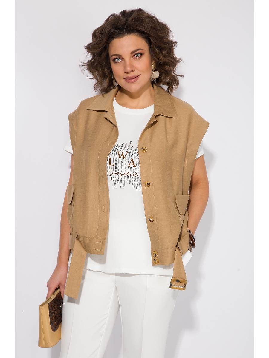 Модель состоит из свободной жилетки песочного оттенка и молочной футболки с печатью.