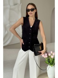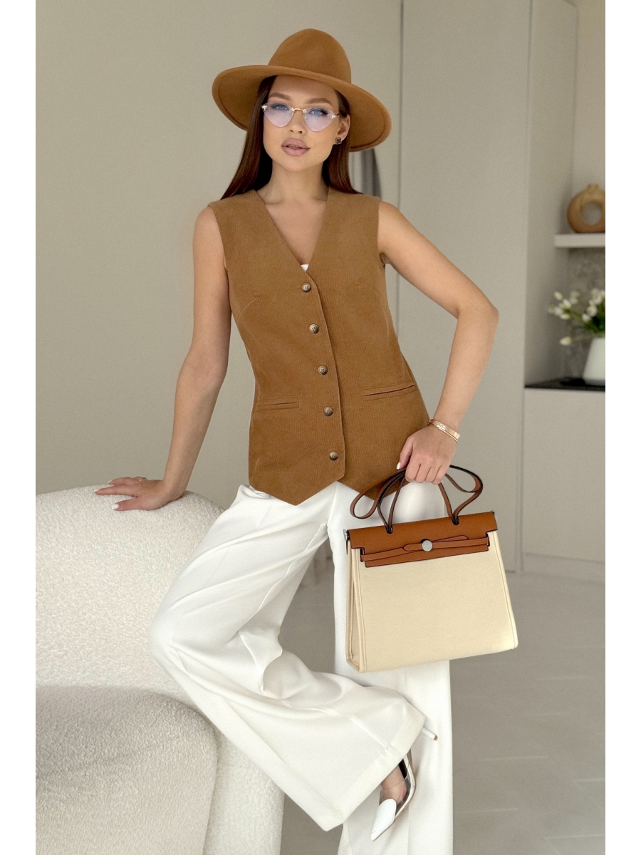 Жилетка женская из текстильной ткани (вельвет-штрукс) на подкладке. По переду расположены нагрудные вытачки, прорезные карманы в ""рамку"". Спинка с рельефами. По линии талии вставлен хлястик. Застежка на петлях-пуговицах. Вырез горловины V-образный.