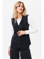 Жилетка женская из текстильной ткани (вельвет-штрукс) на подкладке. По переду расположены нагрудные вытачки, прорезные карманы в ""рамку"". Спинка с рельефами. По линии талии вставлен хлястик. Застежка на петлях-пуговицах. Вырез горловины V-образный.