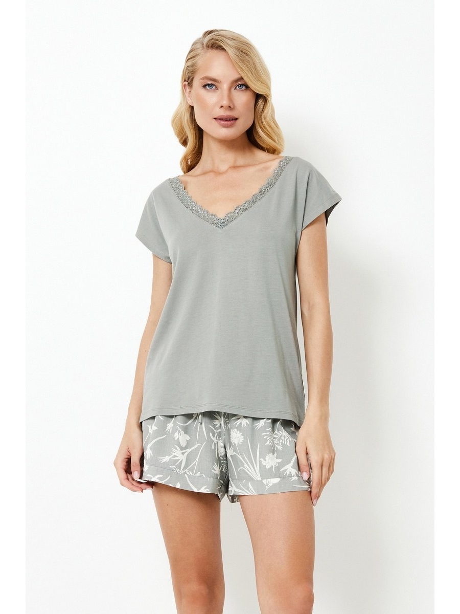 Этот комплект идеально подходит для тех, кто ценит гармоничное сочетание неподвластной времени моды и уютного досуга. Топ с короткими рукавами, выполненный из смеси хлопка и модала, украшен v-образным вырезом, элегантно отделанным тонким кружевом, сочетающим комфорт с шикарным дизайном. Он выполнен в спокойном приглушенном зеленом цвете с оливковым оттенком, излучающем ощущение спокойствия. Шорты, которые завязываются на талии для индивидуальной посадки, завершают образ в том же спокойном зеленом оттенке. Они изящно украшены изысканным цветочным узором, добавляющим элемент изящного стиля в общий ансамбль.