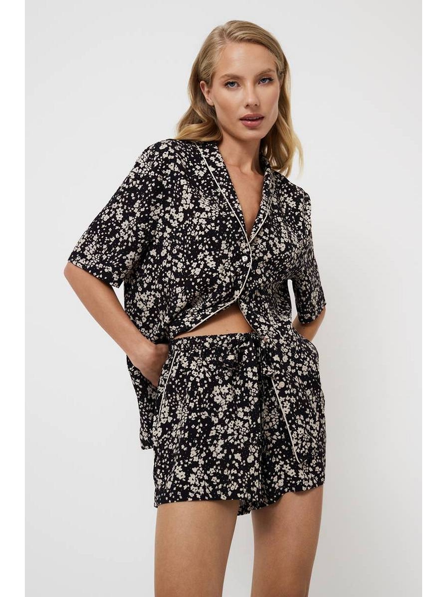 Представляем вашему вниманию пижаму с шортами Elaina — изысканное сочетание стиля и комфорта. Выполнена из лёгкой вискозы с утончённым цветочным принтом. Рубашка на пуговицах длиной до локтя. V-образный вырез с бежевой окантовкой по передней части воротника. Дополняющие рубашку шорты, имеют эластичный регулируемый пояс для индивидуальной подгонки. Удобные карманы, украшенные шикарной бежевой окантовкой, добавляют функциональности и стиля. Идеально для тех, кто ищет элегантность и комфорт в своей ночной одежде.