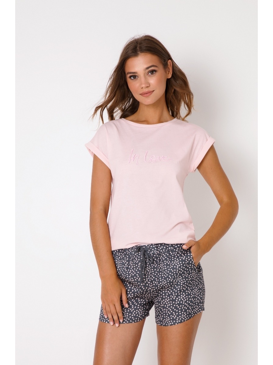 Любовь - это все, что тебе нужно! Короткая пижама Тесса симпатичная, но в то же время удобная и веселая. Верх выполнен из мягкой хлопчатобумажной ткани с вышивкой "Любовь" на груди, а низ выполнен из тканой вискозы с рисунком сердечек. Рукава имеют загнутый вид, талия завязана дополнительным функциональным поясным шнурком. На шортах есть карманы.