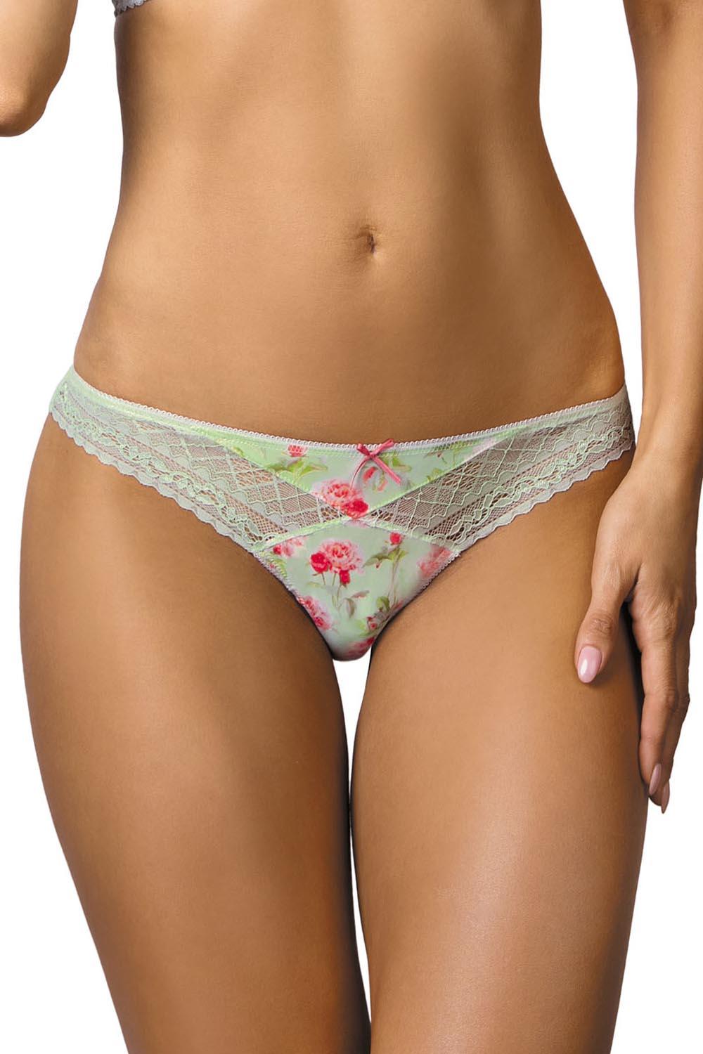 Кокетливые трусики-стринги выполнены из красивого трикотажа с цветочным мотивом и нежного кружева.